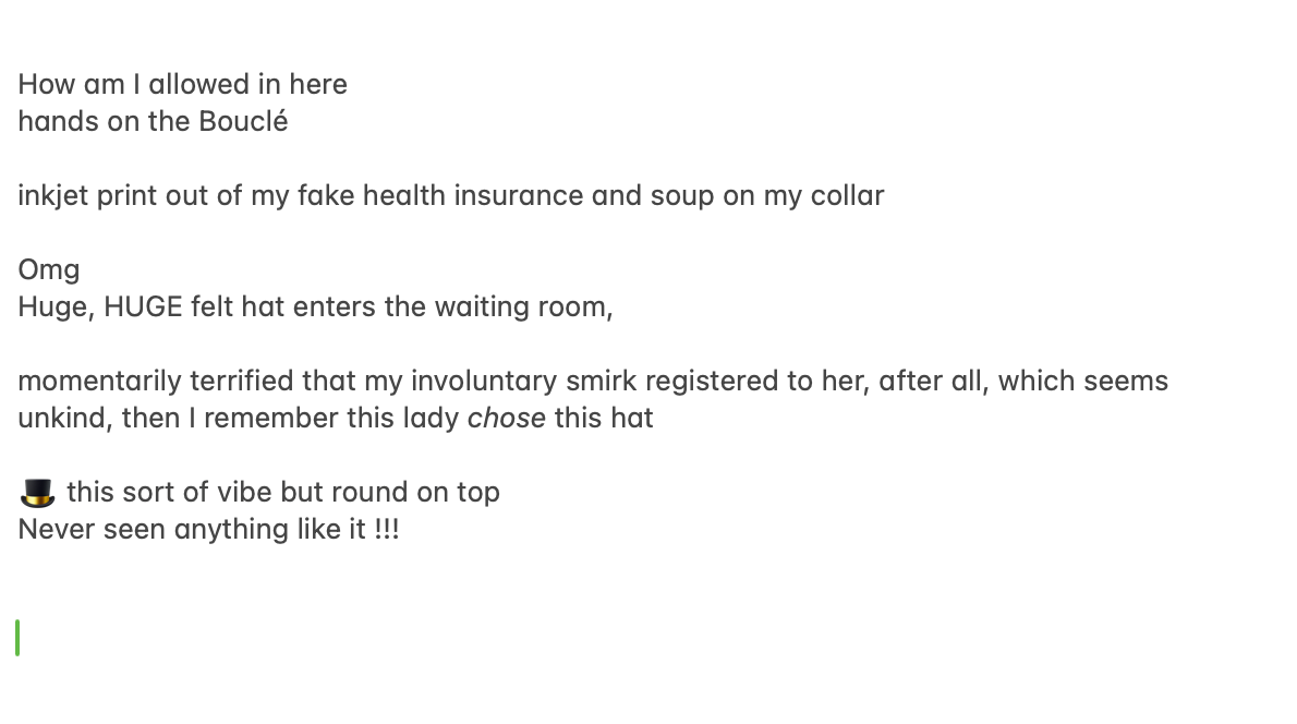 The orthopaedic specialist I pick out online purely based on there being an appointment two hours after i realise the swelling wasn’t going away has thick and beautiful green carpet and they offer you tea. i am terrified i’ve misunderstood how it works and about to be thrown out or forced to pay.